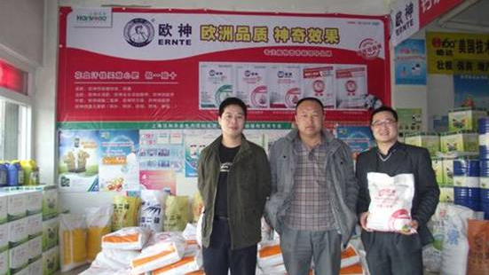3月初,12000畝棉花種植大戶劉永強(居中)在尉犁縣巴州君瑞農資一次購入歐神“鈣鎂硼鋅鐵”15噸,上海漢和農化專家宛飛博士(左一)為其進行用肥用量指導。