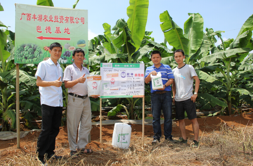 “我種植香蕉十多年了,一代蕉種植不到一年就可收蕉,還是第一次見。”廣西豐湖農業投資有限公司董事長盧春能興奮地說道。盧春能是廣西香蕉協會常務副會長,投資種植香蕉多年,是名符其實的香蕉大王。近日,他發現,用了“歐神”微根露液體肥的香蕉,葉片厚綠,蕉桿粗壯、高大,估計能提前上市,并對微根露的神器效果連連稱贊。