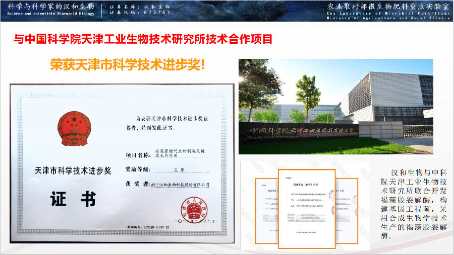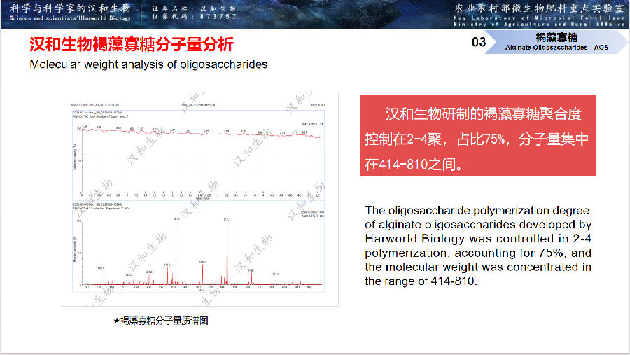 漢和生物與中國科學院天津工業生物技術研究所合作開發褐藻膠裂解酶,酶活達到500000u/ml,為全球最高水平,該項目榮獲“天津市科技進步三等獎”。漢和生物運用2.0版本新型雙功能褐藻膠裂解酶,制備高活性褐藻寡糖,分子量<1000(集中在414-828),液體褐藻寡糖含量做到30%(全球唯一)!參與起草褐藻寡糖(AOS)首個團體標準(T/GXAF0013-2)。