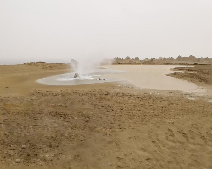 火星地表噴射而出的溫泉形成湖面,霧氣時濃時淡,湖岸有一圈明顯的金黃色,是俄博梁雅丹里面最神秘的硫磺湖,天氣好的時候,湖水像新鮮的菠蘿汁,只有1%的人有幸觀賞到。