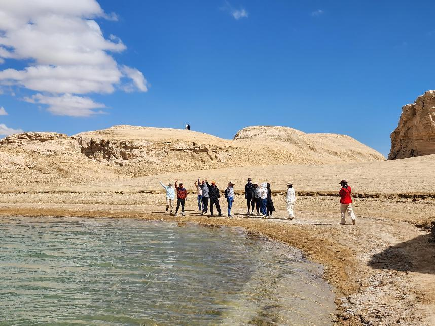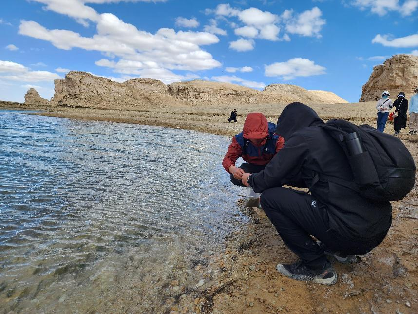 從火星基地出來后,雖然氣溫不高,但是陽光明媚,科考隊繼續前往下一個站點—烏素特水上雅丹。沿途難得發現一處頑強生長的作物,隨即收集取樣。水上雅丹的景色絢麗奪目,雅丹遍布于湖水之中,就像一望無邊的沙漠中出現一片汪洋,雅丹立于汪洋之上。碧湖的藍水,波光粼粼的水面,在酷熱夏季,這里涼爽舒適的微風,吸引著人們來此避暑。湖泊沿岸,有少量藻類作物附著生長,當地水溫很低,水質清澈,能夠生長于此的藻類,可能有特殊的功能、可能是一個新穎的品種。科考隊員采集了水藻以及土樣,期待篩選分離出新物種。