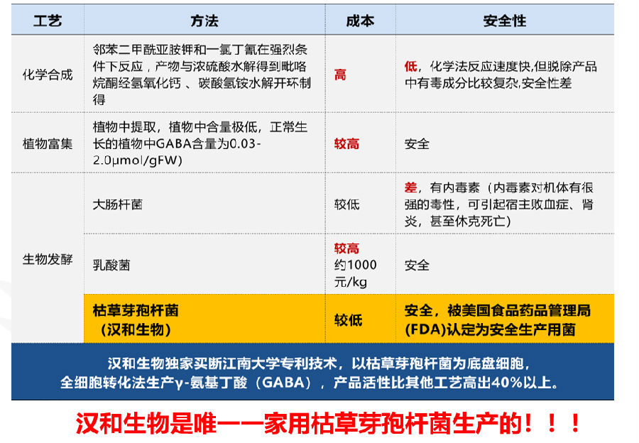 2019年,漢和生物與江南大學合作,全球首家以枯草芽孢桿菌為細底盤細胞,全細胞轉化法生產γ-氨基丁酸。在大幅提高產品活性的同時,也顯著降低了生產成本,并實現了γ-氨基丁酸的產業化生產。