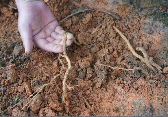 對照組土壤與示范組同屬一個土壤環(huán)境,主根系周圍沒有須根,且有根腐現(xiàn)象,淺層土壤10厘米幾乎沒有須根