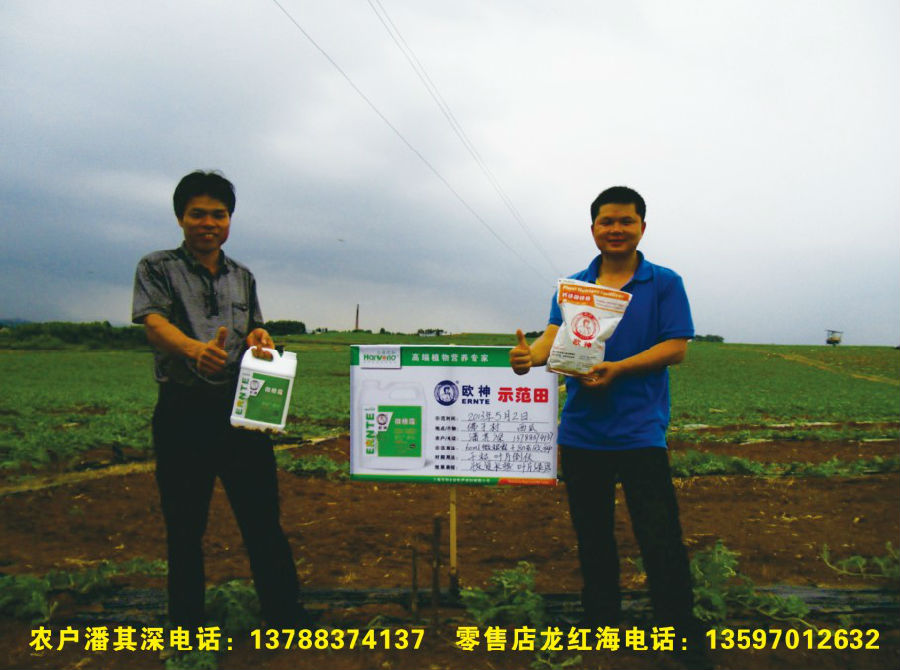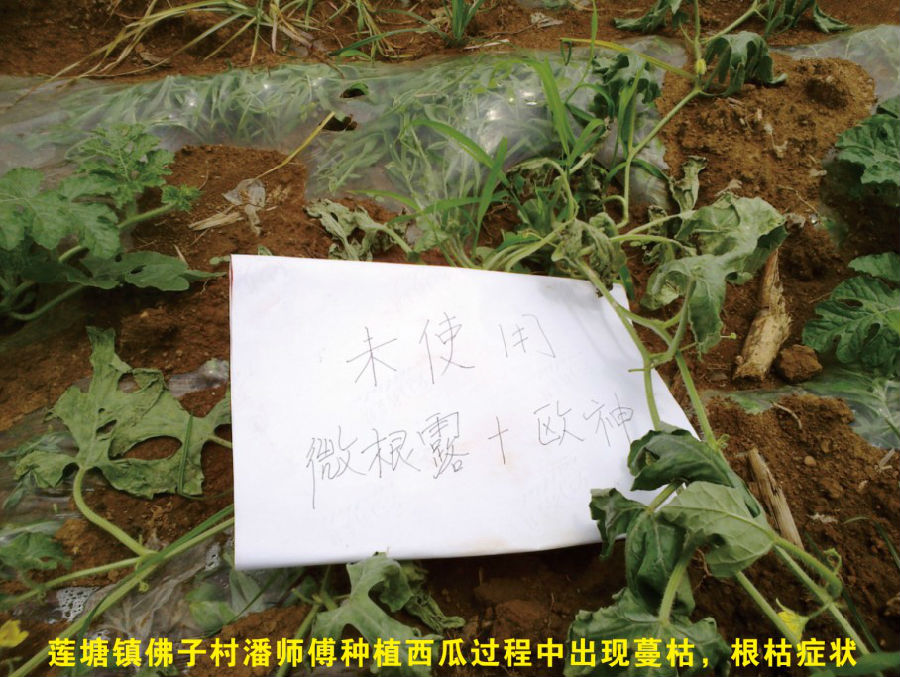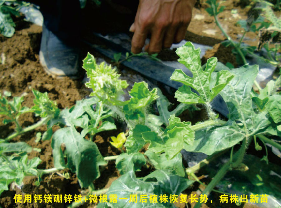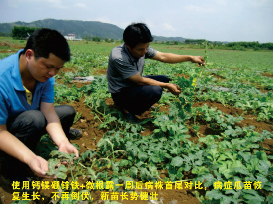 效果:橫縣蓮塘鎮佛子村農戶潘其深種植西瓜60畝,將近十年的西瓜種植經驗,是當地一位有影響力的老師傅。但近來,他也遇到些煩心事。早幾年由于化肥濫用,造成當地土質普遍肥力下降,土壤環境惡化,直接造成了種植西瓜易出現土層病害引起的蔓枯,根枯等癥狀,農戶們換了很多產品,也沒能對這些病害起到特別的療效,只能看著西瓜藤枯萎,最后甚至絕收,更令人心寒的是,這種癥狀在橫縣西瓜種植中,很常見!潘師傅的西瓜地今年也受到了根枯癥狀的影響,不少西瓜藤干枯,倒伏,葉片枯萎,正愁又像往年一樣又要損失不少,經當地零售店老板龍紅海介紹,使用上海漢和鈣鎂硼鋅鐵+微根露的組合配方,抱著試一試的態度,于5月2日以“微根露60ml+歐神鈣鎂硼鋅鐵60g”/桶做淋根處理。5月6日對病株觀察時,發現超過70%以上病株竟然神奇地“站起來”了!葉片厚綠,苗向前伸,不再倒伏,潘師傅看到了轉機。5月9日再次做跟進時,病株已發新苗,長勢得到了恢復,與旁邊未使用“鈣鎂硼鋅鐵+微根露”的西瓜有了非常明顯的對比,一邊是枯萎,一邊是葉片青綠!潘師傅很激動,對在場包括零售店,其他農戶在內的觀摩人員表示,“從前遇到類似根枯的情況,都很難治,這次用漢和的產品,真正的解決了我這里西瓜根枯的老大難問題!”,周圍一同觀摩的農戶看到這效果,當場決定先購買一套組合產品使用!并在技術人員的指導下合理分配使用量。零售店蘇經理表示“通過觀摩產品效果,并看到潘師傅的喜悅心情,現在對漢和生物產品越來越有信心了!今后為了西瓜健康生長,主推歐神鈣鎂硼鋅鐵+微根露!”
