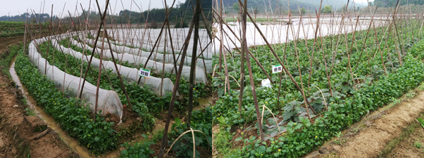 圖1.2014年2月-3月中上旬南寧連續(xù)遭遇低溫陰雨天氣,3月底天氣開始好轉(zhuǎn),但未使用微根露的茄子地還需用薄膜覆蓋,植株長勢弱且參差不齊;而使用微根露的地塊已經(jīng)可以揭膜,且葉片厚綠,植株長勢良好,已經(jīng)有花蕾出現(xiàn)。