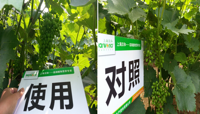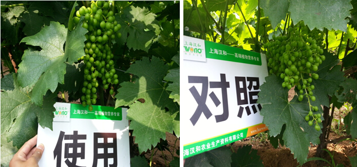 效果:噴放兩遍歐護后果粒表面光澤度發,葡萄果柄處比較粗壯,果粒平均個頭要大;葉片濃綠、柔軟,特別沒有表現出缺鎂癥狀。而沒有噴施歐護的葡萄表光不亮麗,個頭較小,葉片光澤度差一點、比較脆、粗糙。