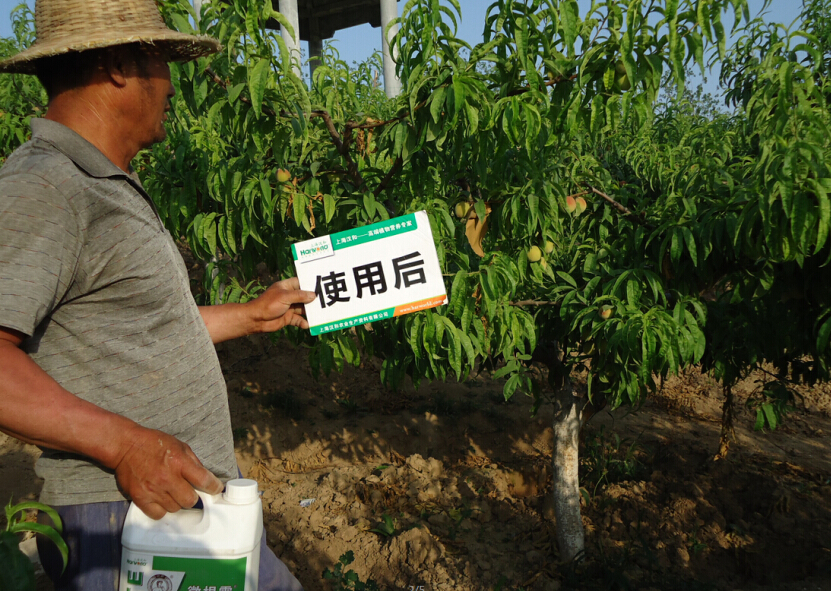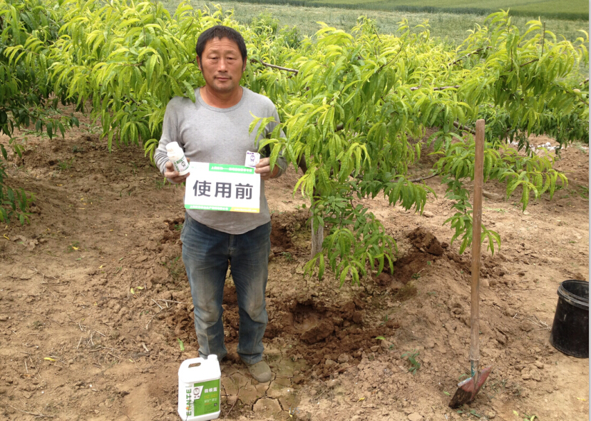 該村露天桃樹面積集中,但是一直有黃化現(xiàn)象,我們感覺這是一次公司產(chǎn)品切入當(dāng)?shù)厥袌?chǎng)和大顯身手的時(shí)候,所以我們先現(xiàn)場(chǎng)查看情況,診斷病因,然后制定微根露+螯合鐵的灌根方案。