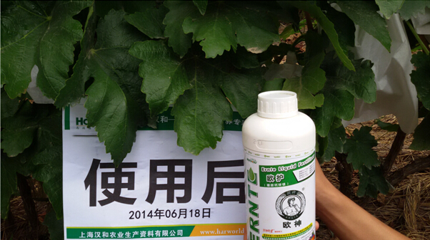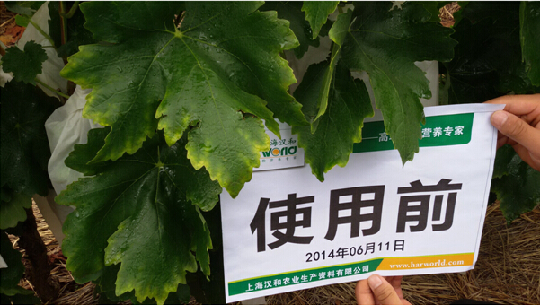 使用歐護7天效果描述:使用前期因為造成缺鎂,葡萄葉片嚴重偏黃,使用歐護7天后,葉片迅速轉綠,色澤光亮濃厚。如下圖(圖1)