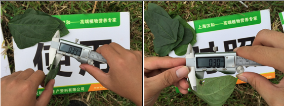 3、葉片厚度: 從對照區(qū)與試驗區(qū)各取同一部位高度大小相近的5片葉進行測量。 |
