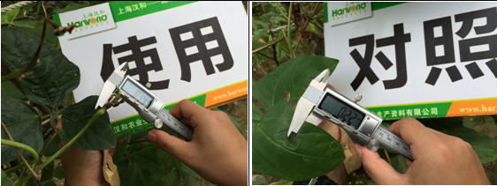 2015年8月3日持續(xù)半個月的雨水過后,對照組未使用因卡波的豆角長勢較弱,黃葉落葉較多,使用了因卡波的豆角整體長勢仍然較好,植株下部老葉仍然保持鮮綠,且葉片比未使用的葉片要厚綠。 | |