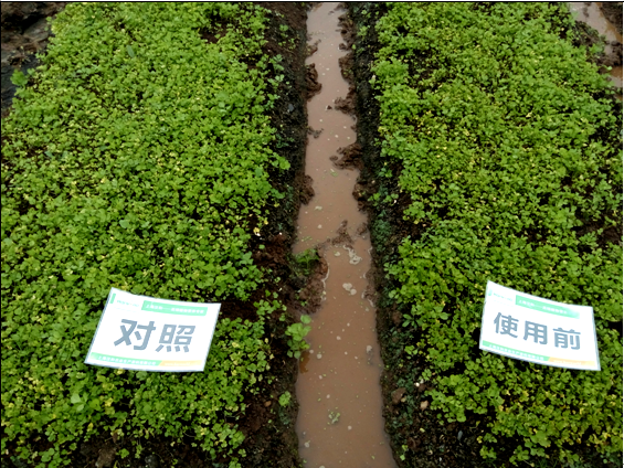 效果說明:使用前全田芹菜子秧整體都表現出葉片黃化、弱苗、死苗、猝倒、參差不齊等現象。經過6天后,對照的整體長勢較前期表現出更嚴重的葉片黃化、弱苗、死苗、猝倒、參差不齊等現象(照片中7月13日對照區剛被種植戶拔了部分秧苗)。而試驗組整體長勢旺,葉子濃綠、弱苗較少、猝倒減少。
