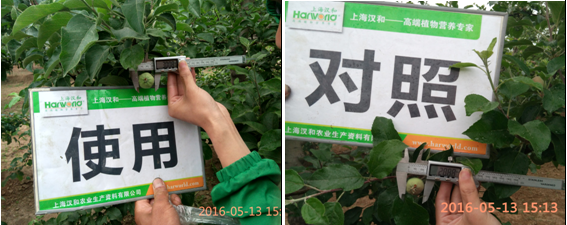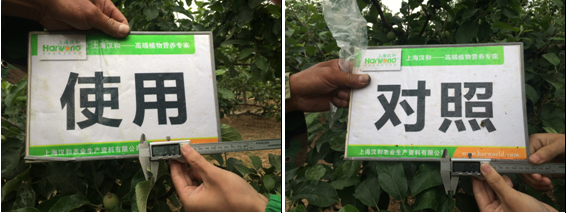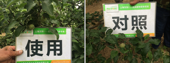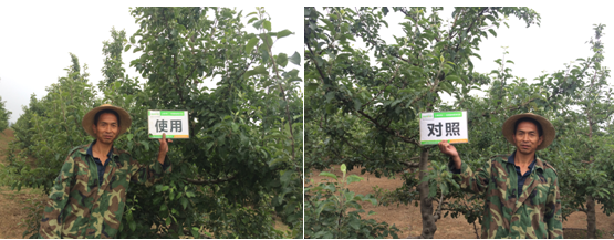 效果說明:通過對比可以看出實驗區(qū)相比對照區(qū)果實和葉片生長都更為健康,果個大,果型好,葉片舒展,深綠,葉面積大,并且表面有光澤。