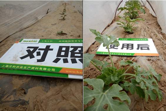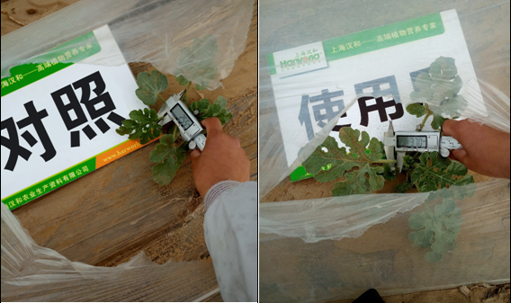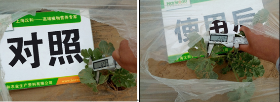 效果說明:使用8天后西瓜葉柄平均粗度達3.188mm,比對照組平均粗度粗0.75mm,養分和水分輸送渠道更多,吸收當然更好。