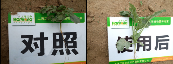 效果說明:在瓜苗受到除草劑危害的情況下,歐神微根露促進作物生根提苗,使用后4天西瓜開始長新根,8天時根數更多,苗子也更健壯。