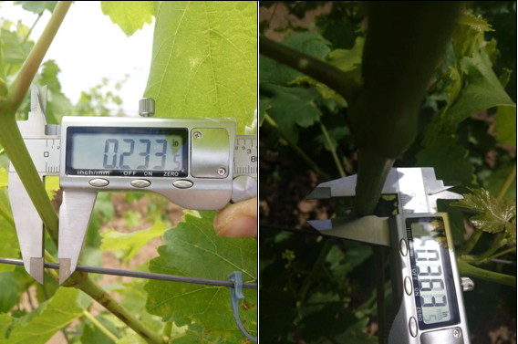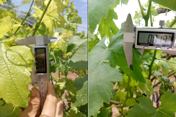 2、莖部調查:隨機在對照區與試驗區各選取7根葡萄莖桿,用游標卡尺測量。